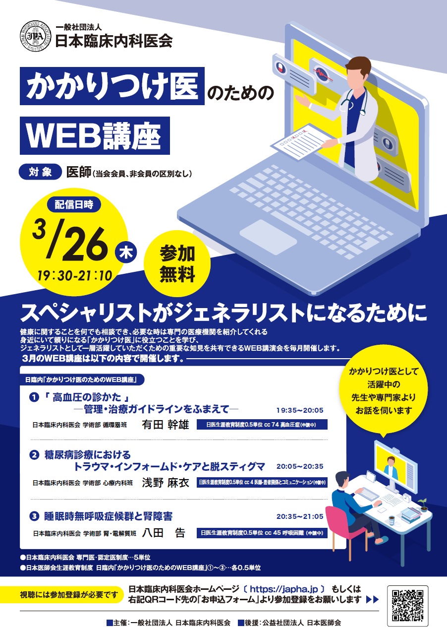 日臨内では毎月、「かかりつけ医のためのWeb講座~スペシャリストがジェネラリストになるために~」と題してWeb講演会を開催しております。参加費については会員・非会員を問わず無料となっておりますので、お申込みのうえ、ぜひご聴講くださいませ。