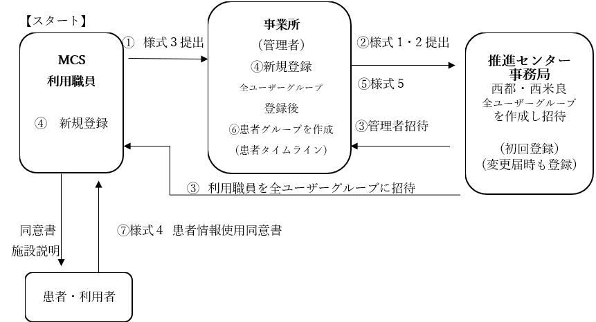 | ①MCS利用職員業務情報保持に関す誓約書を事業所管理者に提出(様式3) ② ・MCS利用申込MCS利用申込書兼登録申請書(様式1) ・連携守秘誓約書(様式2) 以上2文書を事業所管理者が事務局(西都市西児湯地域包括ケア推進センター)に提出。(利用開始初回のみ提出) ③推進センター事務局が作成した西都・西米良全ユーザーグループに管理者および利用職員を招待する。 ④MCSの新規登録は医療機関および管理者及び事業所(多職種)の利用者が個人で行う。 ⑤使用変更がある場合は使用変更届出書を事務局に提出。(様式5) ⑥全ユーザーグループ登録後、患者グループは各自にて作成し招待して開始する。 ![]() ⑦業務情報保持に関する誓約書(様式3)、患者情報使用同意書(様式4)については、推進センターへの提出の必要はなく事業所での保管となります。 ・西都市西児湯地域包括ケア推進センター事務局に提出された様式は全てコピーをとり事業所での保管をお願いします。 |